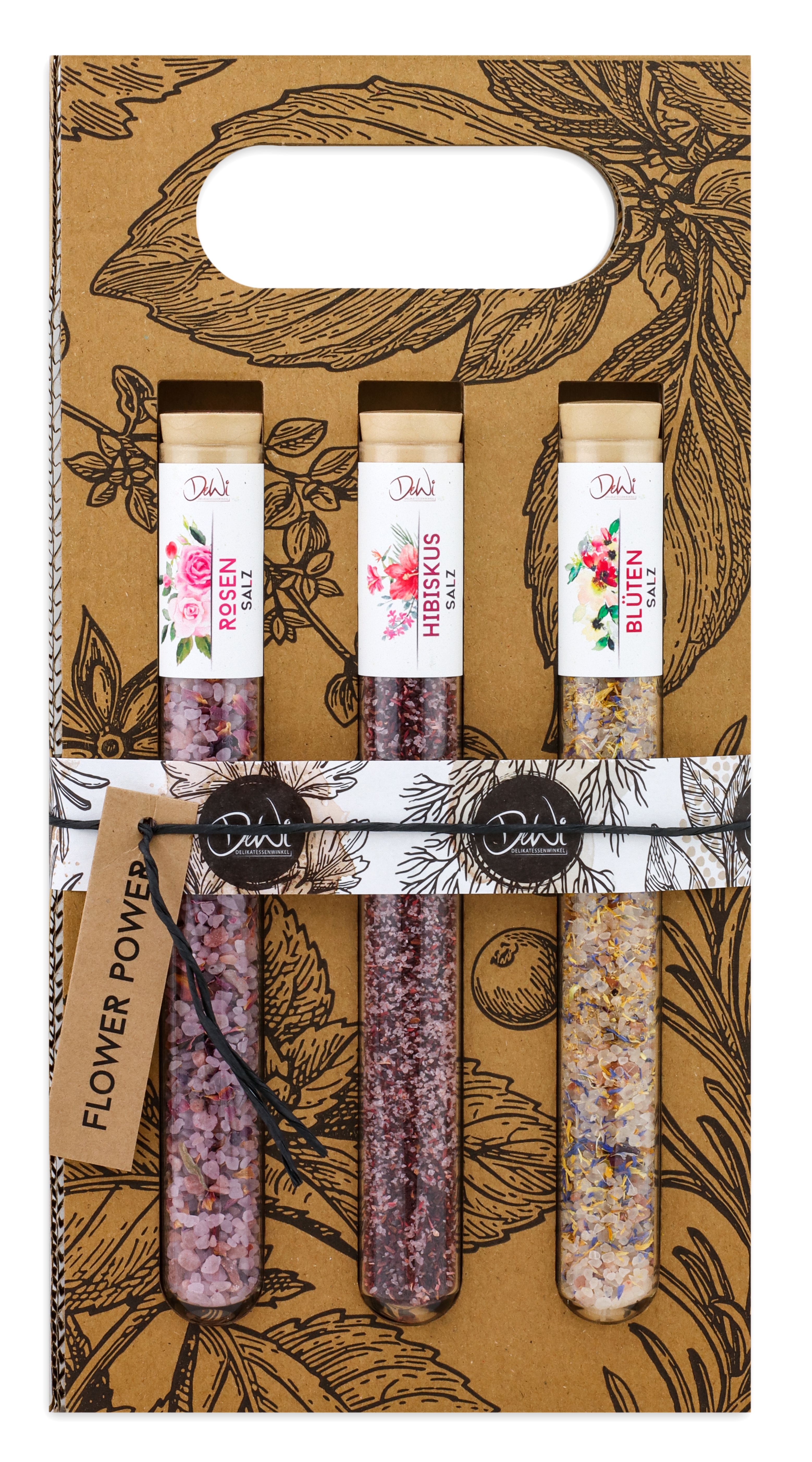 Blüten Salz ST XL - 55 Gramm: Zutaten: Rosa Kristallsalz (97%), Blütenmischung (3%) (Ringelblumenblüten, rote Kornblumenblüten, blaue Kornblumenblüten)