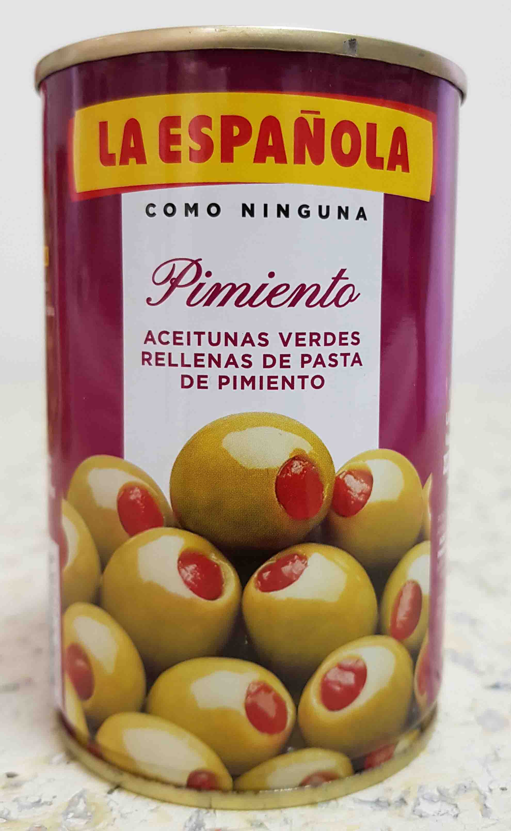 Zutaten: grüne Manzanilla Oliven, Paprikapaste 20% (Paprika, Stabilisatoren: Natriumalginat, Guargummi, Calciumchlorid) Salz, Säuerungsmittel: Zitronensäure, Antioxidans: Ascorbinsäure.