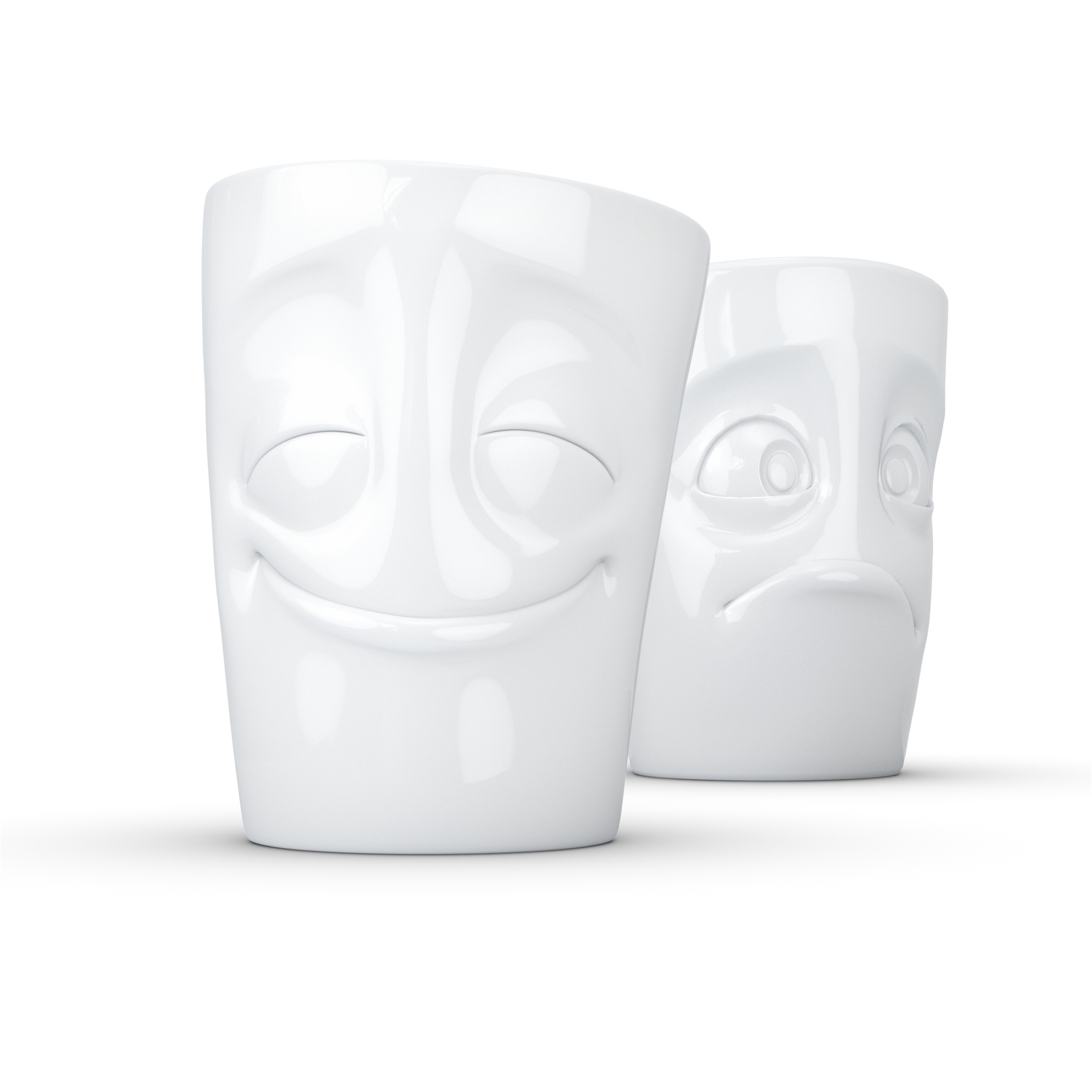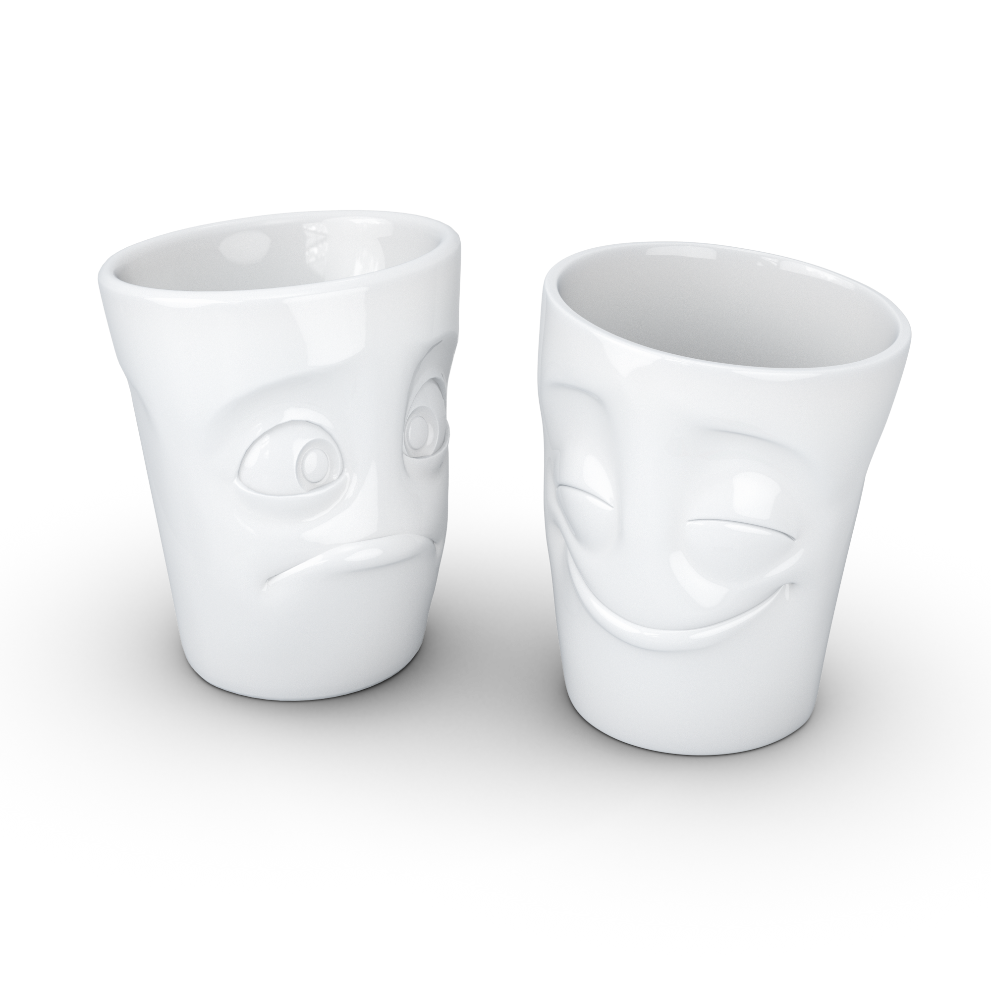FiftyEight Becher Set "vergnügt & verdutzt" ohne Henkel in Weiss. Hier werden die "Henkelbecher" zwar zum "Becher", bieten aber neben dem Genuss von Kaffee, Tee und Kakao noch weitere Einsatzmöglichkeiten, etwa als schicker Stifthalter auf dem Bürotisch.