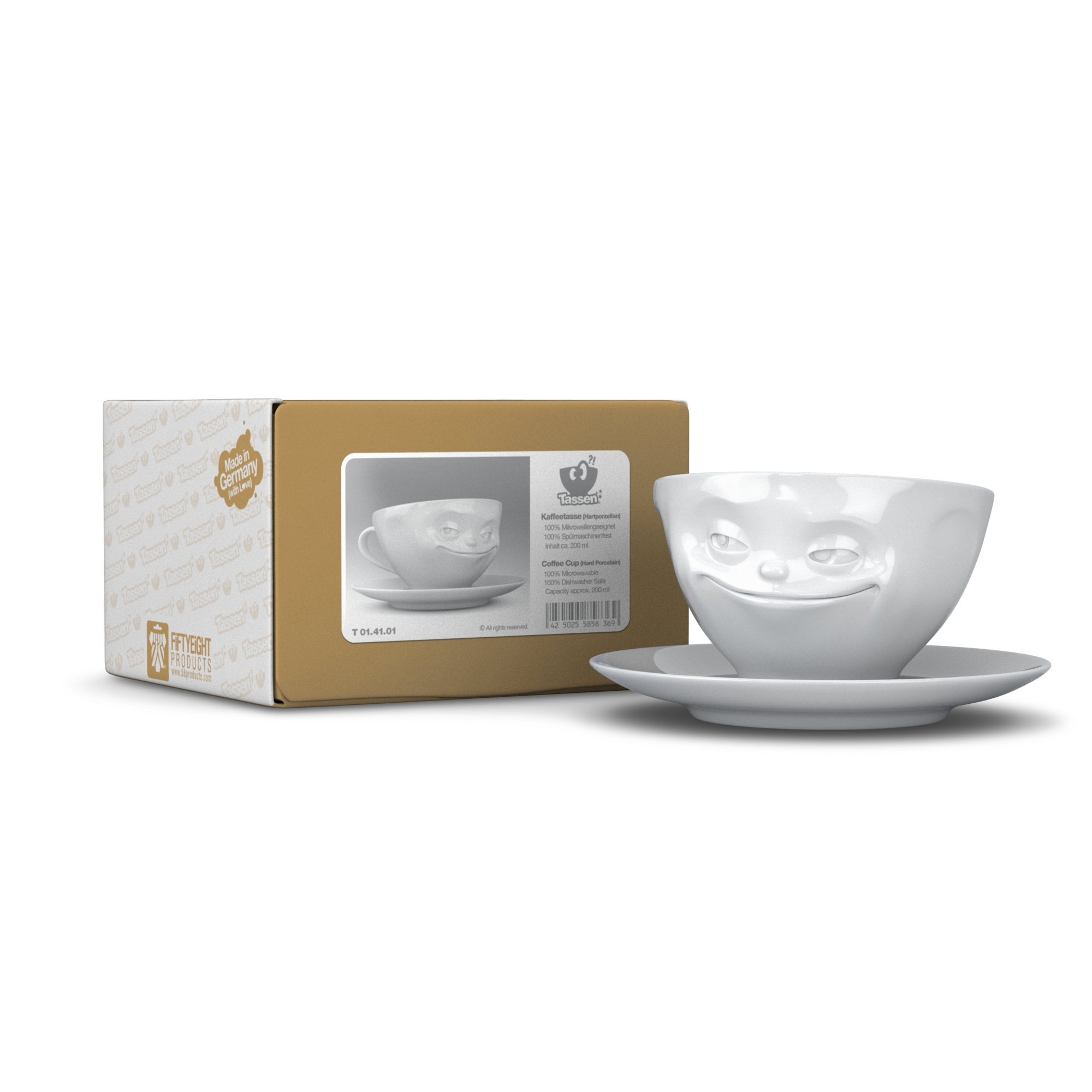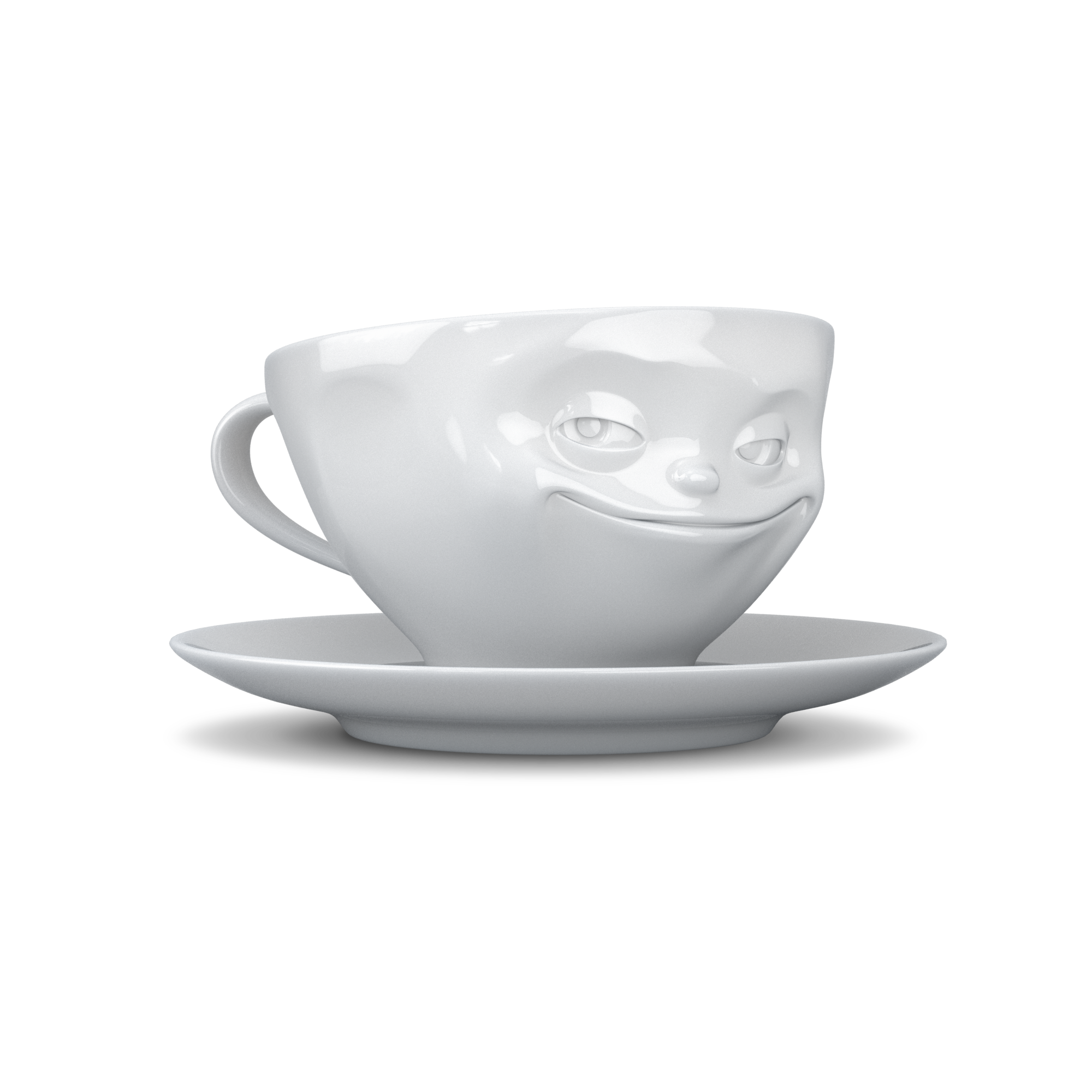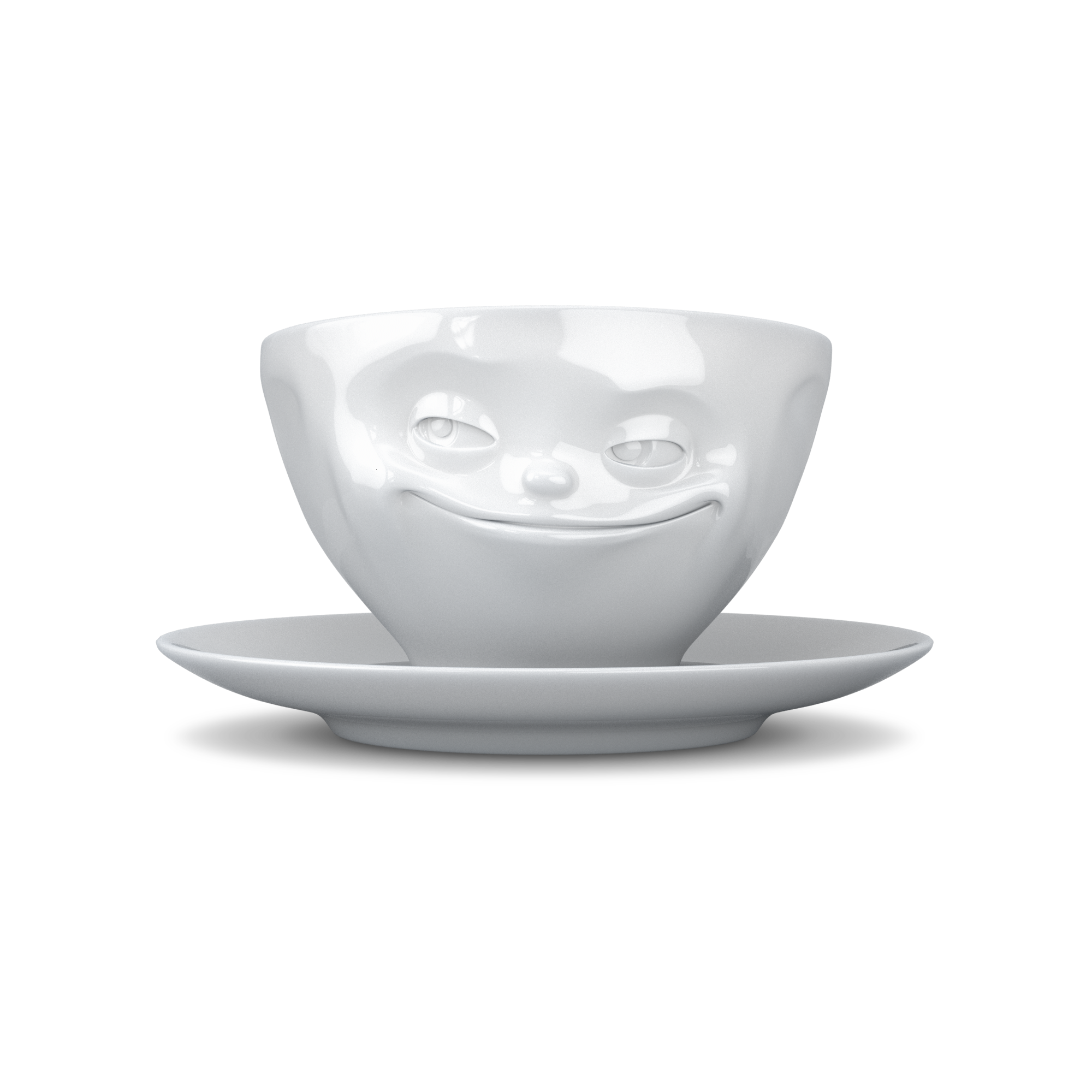 FiftyEight grinsende Tasse in Weiss. Mit Henkel und Unterteller - für eine große Tasse Kaffee, Tee oder Kakao.