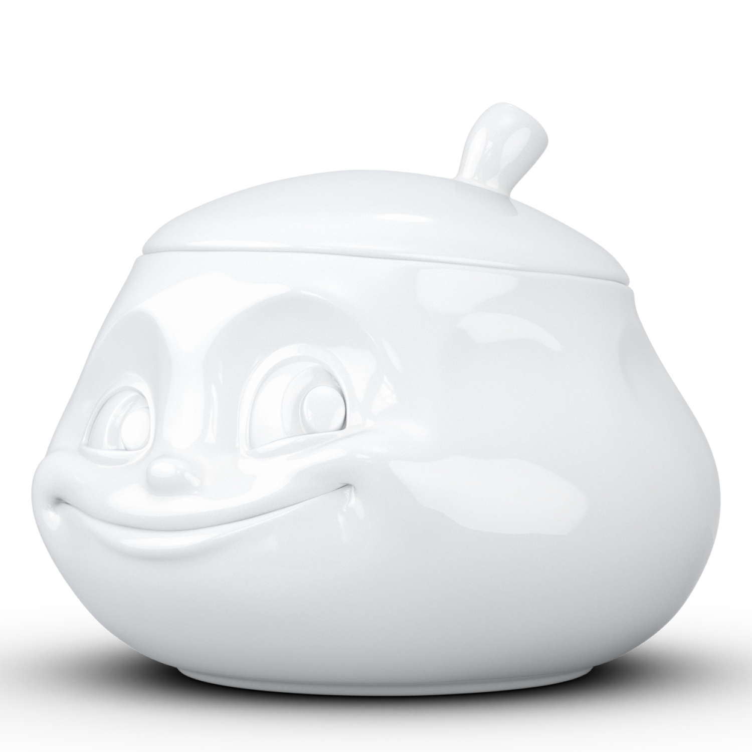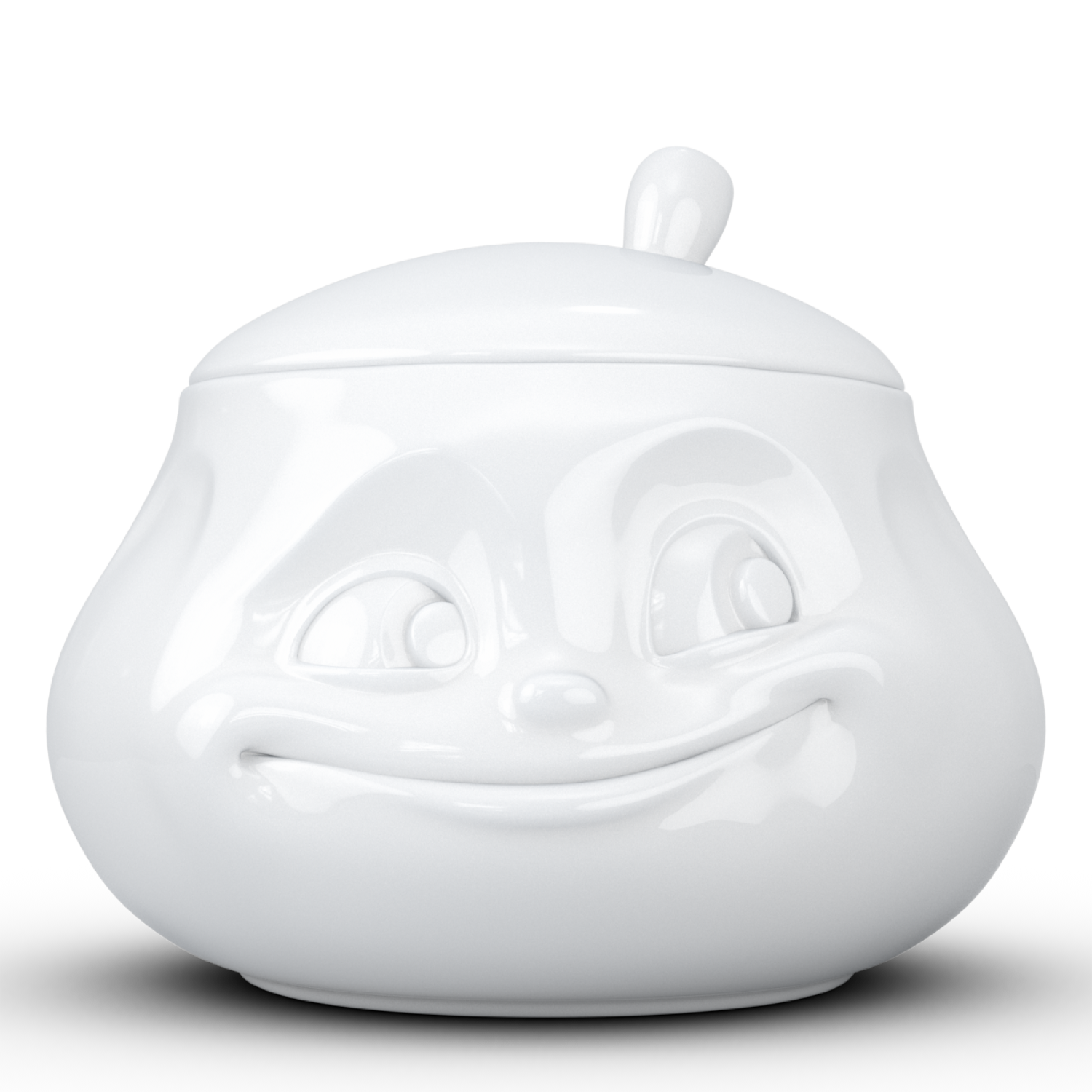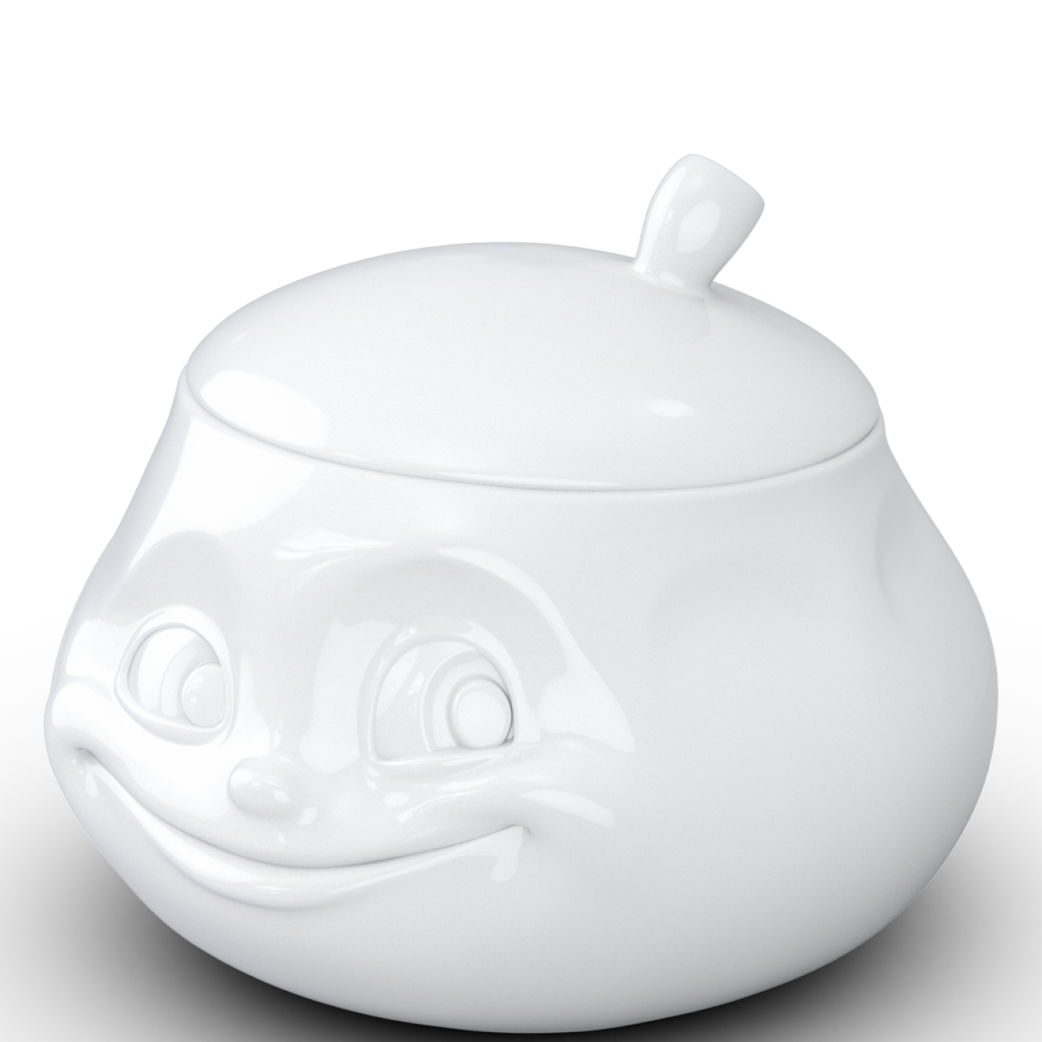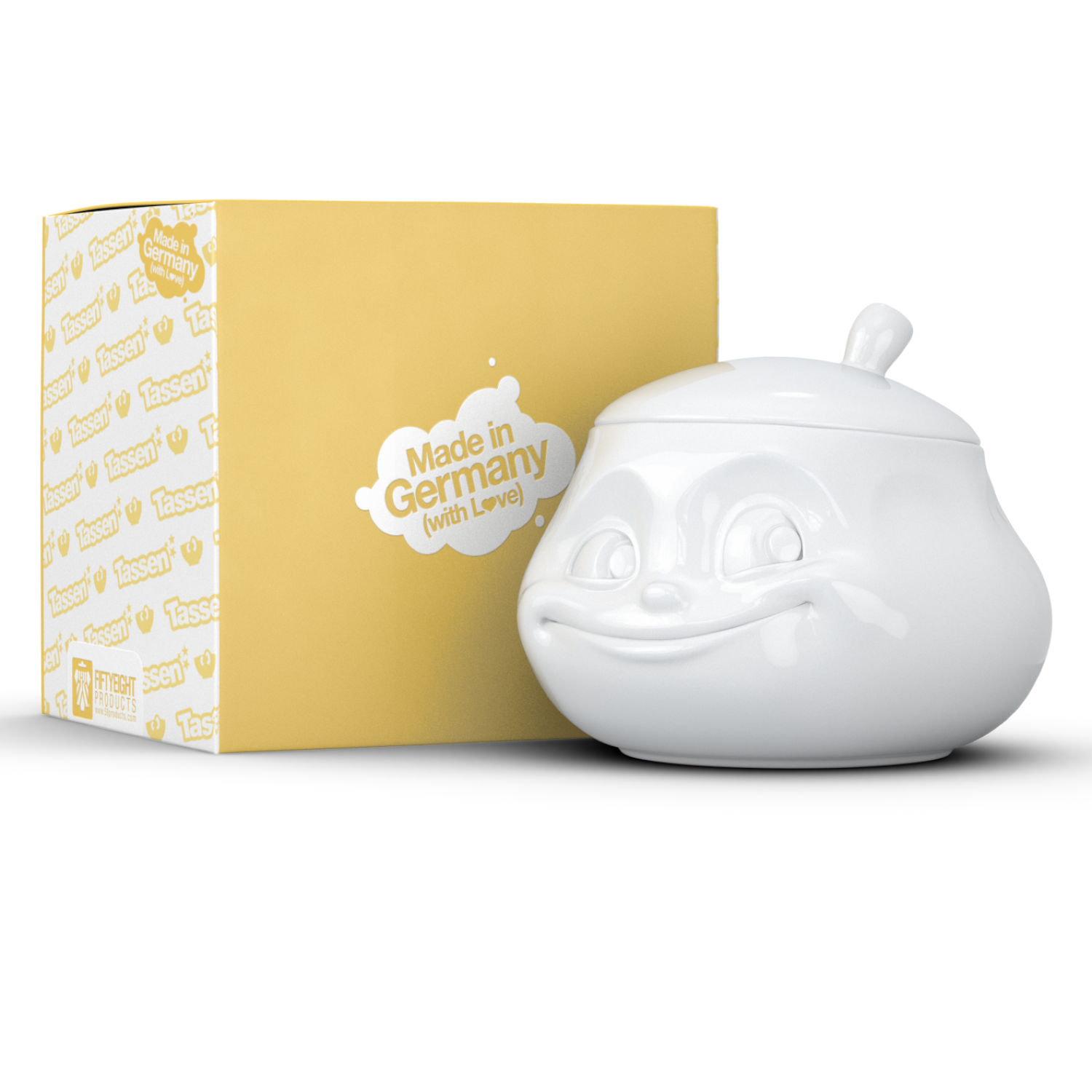 Als besonderen Clou enthält die Zuckerdose „Süß“ unter dem abnehmbaren Deckel eine Aussparung für den Zuckerlöffel – und schließt ihren Deckel auch mit Löffel im Inneren. Die Kleine hält also „dicht“ und kann daher auch mehr, als nur Zucker servieren – zum Beispiel Marmelade, Honig, süßen Senf, Parmesankäse oder Gewürze.