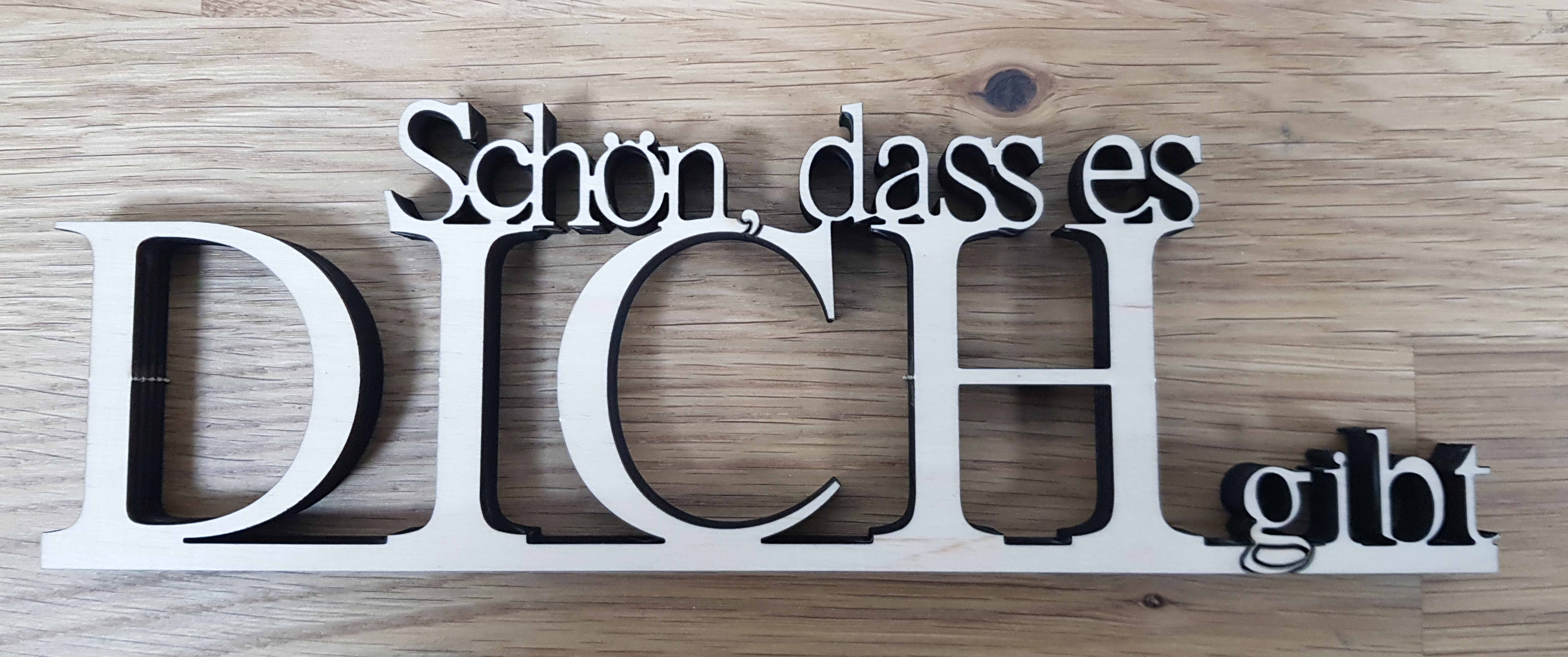 Holz Dekoschrift "SCHÖN, DASS ES DICH GIBT" Größe ca. 22,5 x 7,5 cm Material: hochwertiges Birkenmultiplex Verarbeitung: Oberfläche matt lasiert,, Kanten leichte grau/schwarz Färbung - 3D Effekt MADE IN PFUNGSTADT