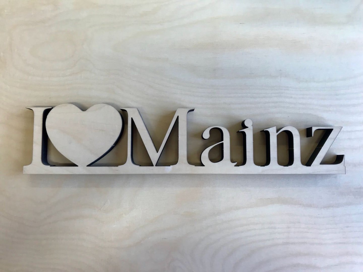 Holz Schriftzug "I Love Mainz" Größe ca. 7,5 cm x 53 cm Material: hochwertiges Birkenmultiplex Verarbeitung: Oberfläche matt lasiert,, Kanten leichte grau/schwarz Färbung - 3D Effekt