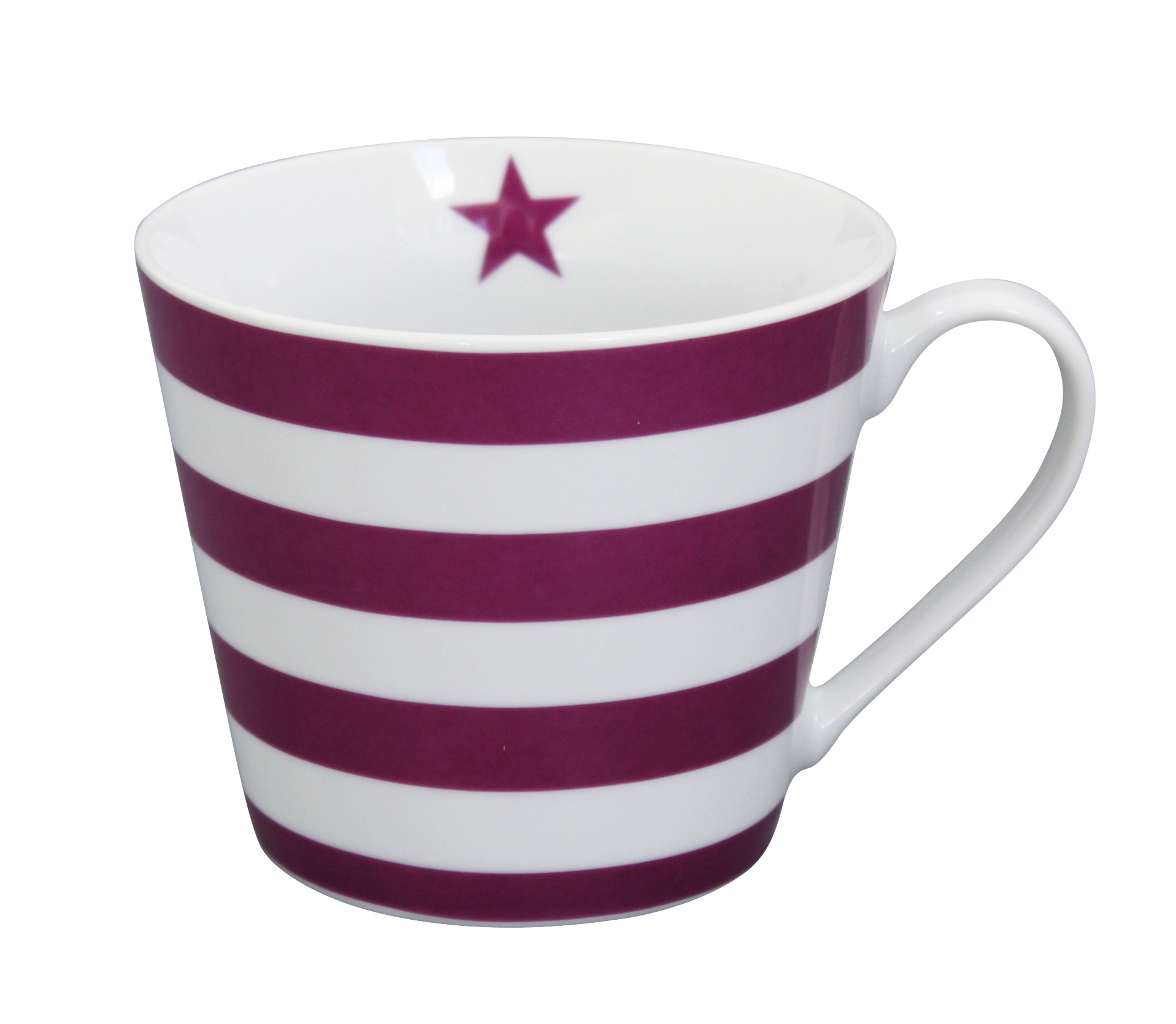 Porzellantasse STRIPES in bordeaux mit Innendruck Stern in bordeaux.