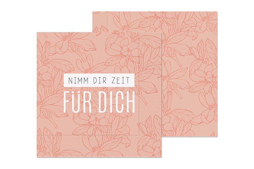 Diese Servietten mit der Botschaft NIMM DIR ZEIT FÜR DICH aus der Relax machen die Tischdekoration perfekt. Inhalt: 20 Stück Maße: 33 x 33 cm Material: 2-lagiges Papier