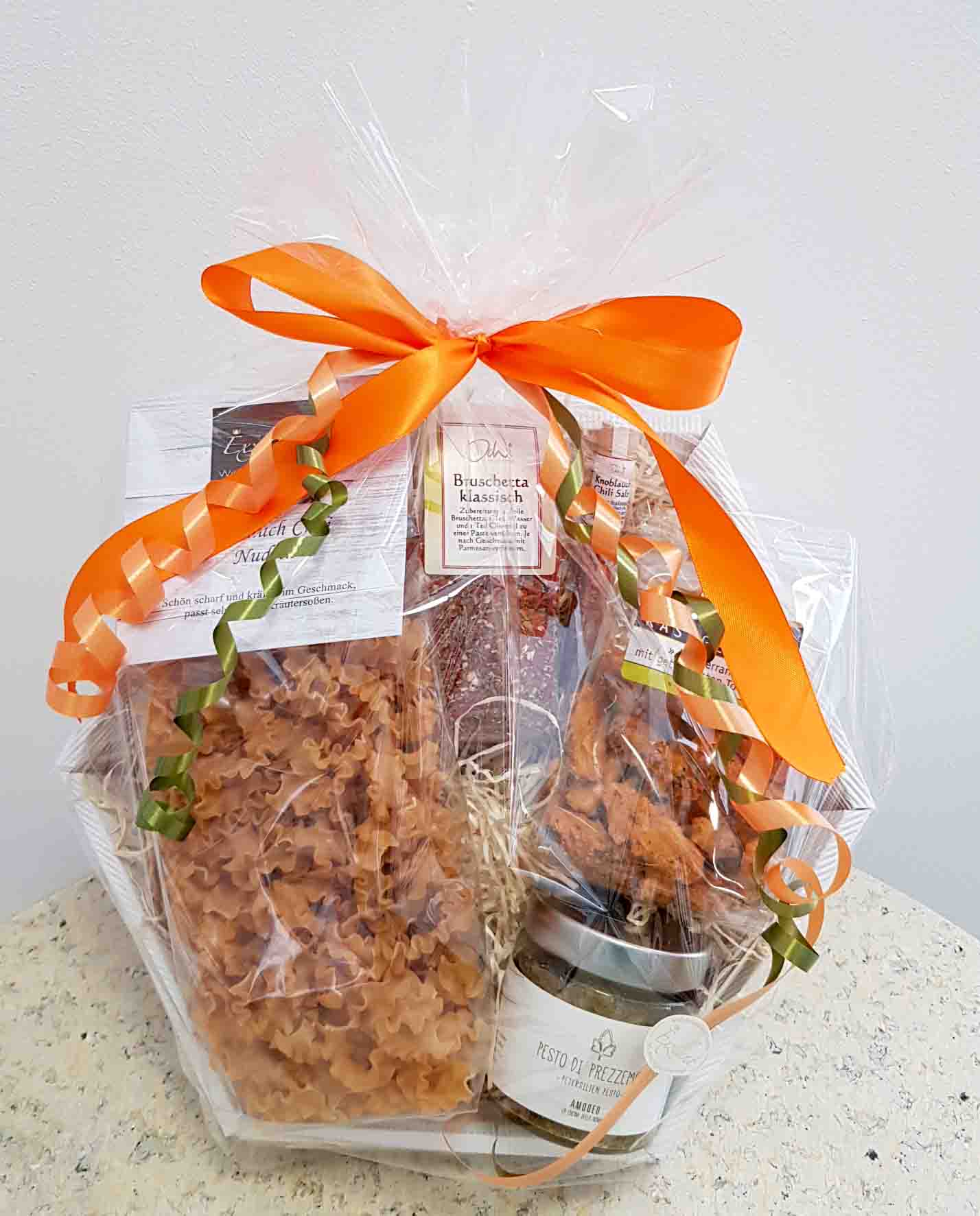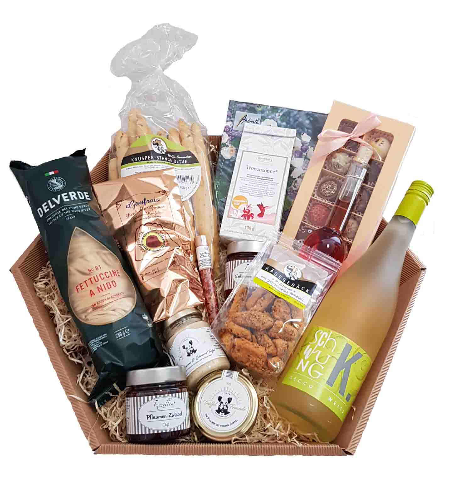 In unserem Präsentkorb/Genusskorb "Genussmomente" haben wir verschiedene Leckereien aus unserem Sortiment zusammengestellt.