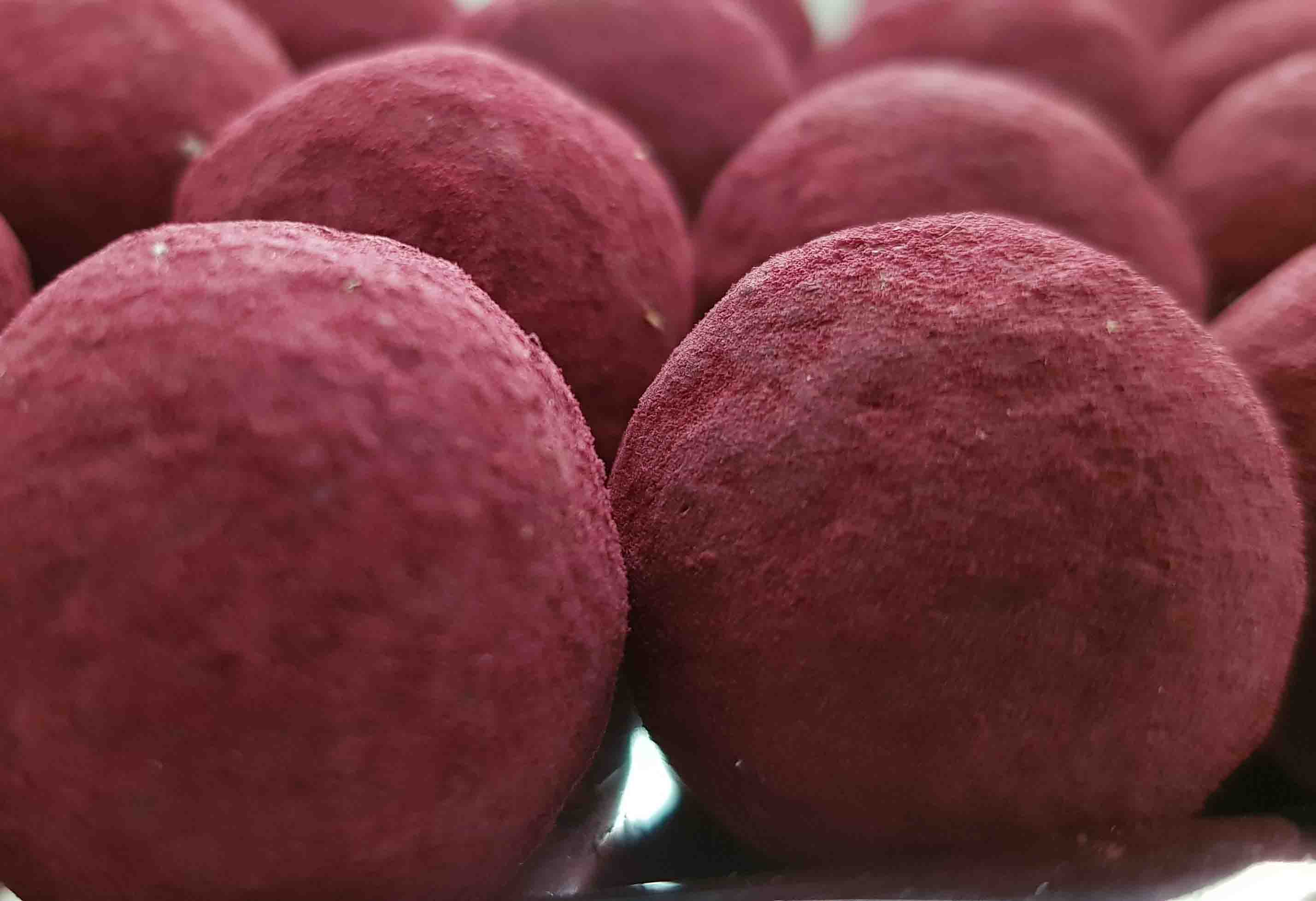 Zutaten: Zucker, Kakaobutter, SAHNE, VOLLMILCHPULVER, Heidelbeerpulver (Heidelbeeren, Maltodextrin), Marc de Champagne (6%), Weißwein (5%), Feuchthaltemittel: Sorbit, Glukosesirup, BUTTER, Johannisbeersaftkonzentrat (3%), natürliches Vanillearoma, Emulgator: SOJA-Lecithin, natürliches Aroma