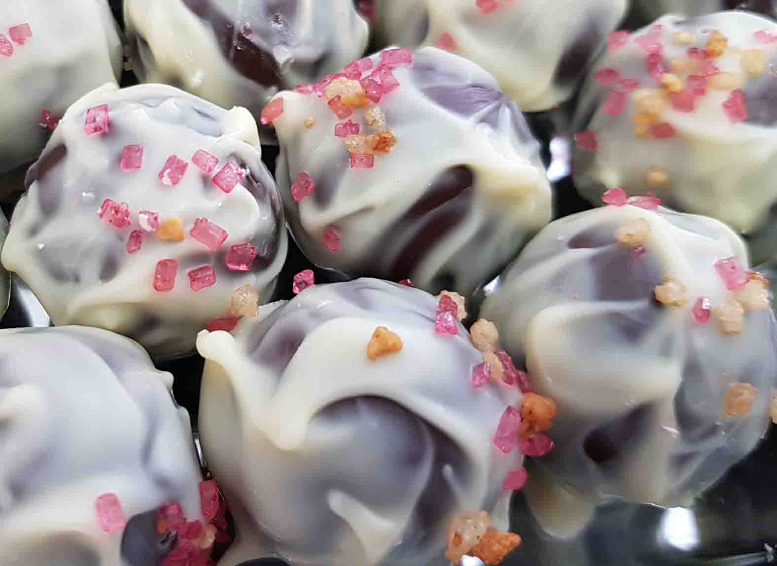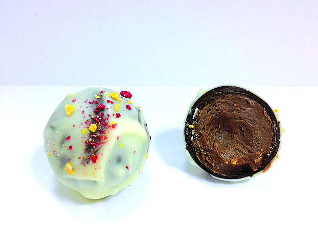 Zutaten: Zucker, Kakaobutter, VollMILCHpulver, Kakaomasse, Schlagsahne (LAKTOSE, MILCH), Alkohol, Molkenpulver (MILCH), Glukosesirup (WEIZEN), Aroma, Passionsfrucht, Aprikosenpüree, Emulgator: E322 (SOJA), Himbeeren, modifizierte Kartoffelstärke, Verdickungsmittel: E401.