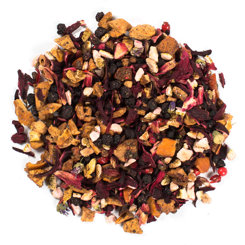 Das dunkle Rot der Tasse passt zum Duft reifer Heidelbeeren, den dieser Tee verströmt. Eine kräftig-fruchtige Mischung mit Holunder, Heidelbeeren und Hibiskus.