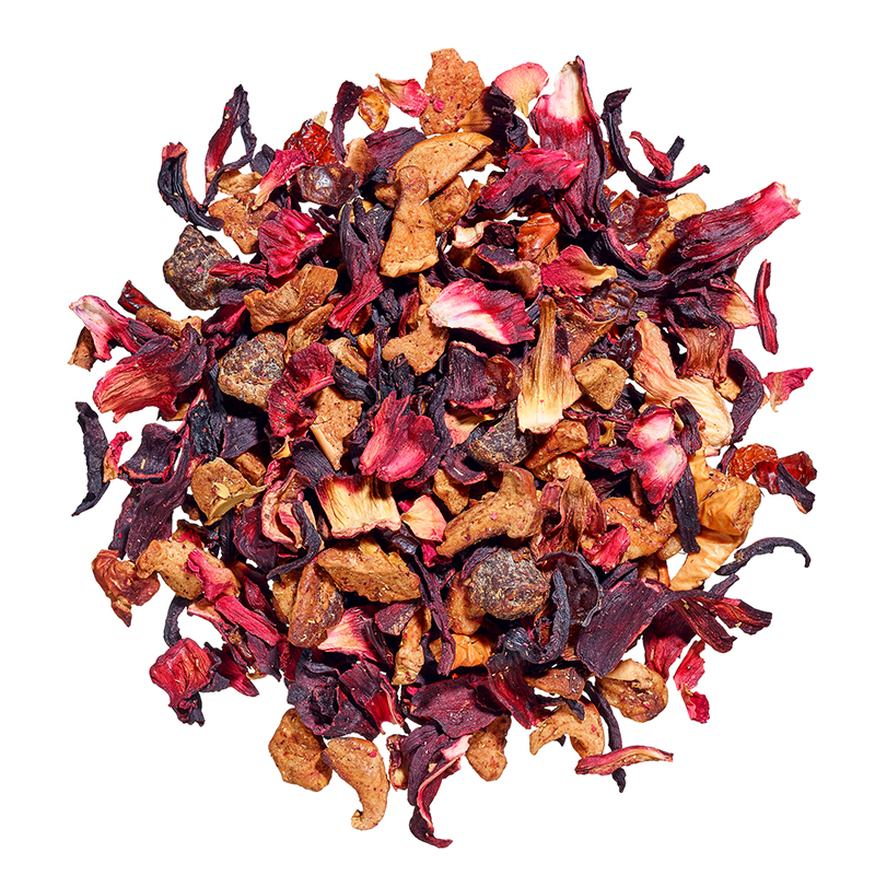 Zutaten: Apfelstückchen, Hibiskus, Hagebuttenschale, Pfirsichstückchen (Pfirsich, Reismehl), Aromen, Ringelblumenblüten, Rooibos, Rosenblüten, Zimtstückchen